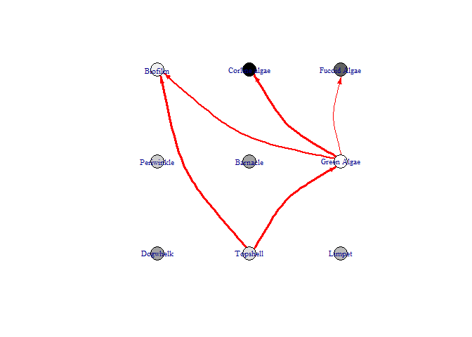 #> 6 -3 -1The details of this interaction matrix are discussed in the main text of the paper, which is under review in Ecological Informatics [we will update this shortly]. Essentially it explains direct interactions between what is here the species or taxon in the row on the species or taxon in the column.